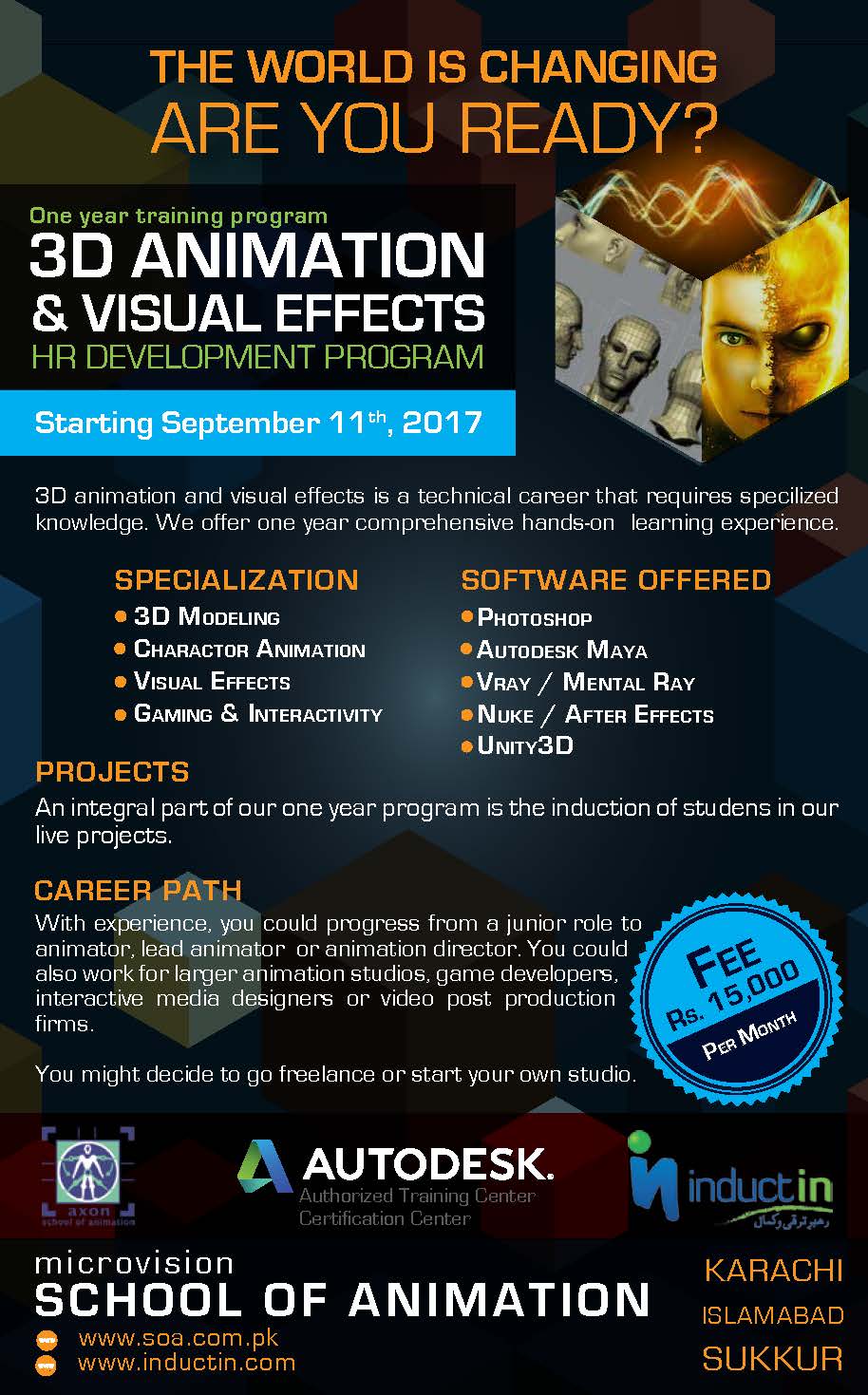 This one year, 3D Animation & Special Effects program is a comprehensive training in 3D using industry standard software such as Autodesk Maya, Unity3D, NUKE, ZBrush, After Effects, Photoshop, Audition & Premiere. Students in this 3D Animation & VFX, one-year Program get the opportunity to learn the technical and artistic tools they need to master 3D animation and visual effects for film, video, and content creation. After the program, they may choose to become independent animators or to pursue a career in the film, gaming, interactivity, or commercial industries.